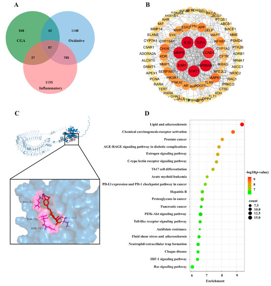 Network pharmacological analysis between CGA, oxidative stress, and inflammation. (A,B) Intersection analysis between CGA targets and the disease targets of oxidative stress and inflammation, as well as screening of core targets; (C) the schematic diagram of the interaction between CGA and TLR4; (D) the top 20 KEGG pathways.