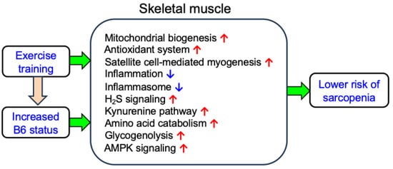 Sampson et al. [15] investigated the effects of consuming diets with different levels of B6 (a marginal B6-deficient diet [1.2 mg PN HCl/kg diet] versus a normal diet [5.8 mg PN HCl/kg]) over nine weeks of the protein fractional synthesis rate in the skeletal muscle of growing rats. Compared to the marginal B6-deficient diet, the normal diet tended to increase protein synthesis rates (+26%, p = 0.05) [15]. In another study, Suidasari et al. [13] compared the effects of consuming a marginal B6-deficient diet (1 mg PN HCl/kg) versus a recommended level of B6-containing diet (7 mg PN HCl/kg) over six weeks on gene expression in rat skeletal muscle. They observed significant increases in the expression of various genes responsible for myokines, myogenesis, mitochondrial biogenesis, and energy metabolism in the higher B6 group [13]. The products of these genes included interleukin (IL)-6 (a stimulator of muscle hypertrophy) [16], IL-7 (a stimulator of immune function) [16], IL-8 (a stimulator of muscle neovasculization) [16], secreted protein acidic and rich in cysteine (SPARC, an essential factor for muscle development and regeneration, mitochondrial biogenesis, and 5′ adenosine monophosphate-activated protein kinase (AMPK) activator) [17], growth differentiation factor 11 (GDF-11, a factor for the rescue of the proliferative and regenerative capabilities of muscle) [18], myonectin (an activator of AMPK, mitochondrial biogenesis and stimulator of muscle growth) [19], leukemia inhibitory factor (LIF, a key regulator of muscle growth and regeneration) [20], apelin (a potential regulator of physical performance) [21], retinoic acid receptor responder 1 (RARRES1, a tumor suppressor), [22] heat shock protein 60 (HSP60, a stimulator of muscle cytoprotection and mitochondrial biogenesis) [23] and myogenin (an essential regulator of myofibre growth and muscle stem cell homeostasis) [24]. Additionally, the expression of antioxidant genes of nuclear factor erythroid 2-related factor 2 (Nrf2) [25] and its regulated enzymes involving heme oxygenase 1 (HO-1) [26], superoxide dismutase 2 (SOD-2), glutathione peroxidase 1 (GPx-1), and glutathione S-transferase (GST) were significantly higher in the 7 mg B6/kg group [13]. While the effect of exercise on the expression of RARRES1 gene is unclear, exercise training is known to up-regulate the expression of all other genes mentioned, similar to the effects observed with B6 supplementation [13,16,27,28,29,30]. These findings have led to a hypothesis suggesting that B6 may play a role in skeletal muscles as an exercise-mimetic factor (Figure 1).