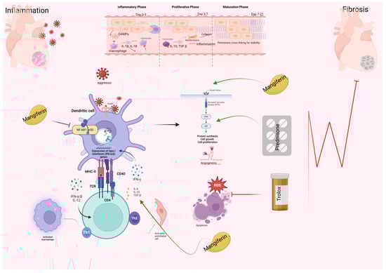 A proposed schematic representation of the progression from inflammation to fibrosis in heart tissue following exposure to an external pathogen. Dendritic cells recognize the pathogen, triggering the activation of the nuclear factor (NF)-κB/p50 signaling pathway, leading to the expression of type I interferon (IFN-α/β) genes. This interaction further activates T helper (Th) cells, with Th1 promoting inflammation via cytokines such as IFN-γ and Th2, mediating anti-inflammatory responses through interleukin (IL)-6, IL-23, transforming growth factor (TGF)-β, and Th17, contributing to chronic inflammation and fibrosis. Macrophages also amplify the inflammatory response through cytokine release. Mangiferin inhibits the NF-κB pathway, thereby reducing immune cell activation. Trolox reduces oxidative stress by decreasing reactive oxygen species (ROS) and preventing apoptosis, while Prednisone is used to decrease inflammation. Additionally, the activation of receptor tyrosine kinases (RTKs) initiates the PI3K/Akt pathway, driving cell growth, proliferation, and angiogenesis, ultimately leading to tissue remodeling and fibrosis.