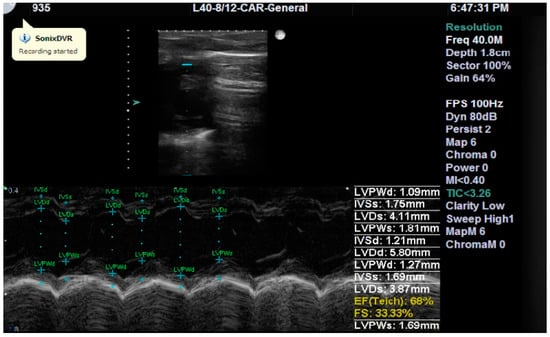 Echocardiographic evaluations were performed using an Ultrasonix Medical corporation SonixTablet (Richmond, BC, Canada) system equipped with a S12-4MHz linear probe transducer. The animals were shaved bilaterally at the thorax, and a generous amount of echocardiographic gel was applied. Rats were positioned in dorsal recumbency, as described by Brown et al. [35]. The examination began with the parasternal long-axis 4-chamber view to subjectively assess contractility and the presence of pericardial fluid. Next, the short-axis view at the level of the papillary muscles was used to obtain M-mode measurements of the left ventricular walls and chamber dimensions, specifically the interventricular septum (IVS), left ventricular internal diameter (LVID), and left ventricular posterior wall (LVPW) during systole and diastole, across three cardiac cycles.
