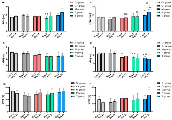 Significant changes were observed in the Mangiferin group. On day 2, the LVDs was significantly smaller compared to the positive control group (p < 0.05). By day 21, differences in LVPWd were reported in the Mangiferin group, with significantly lower values compared to the Trolox group (p < 0.001).