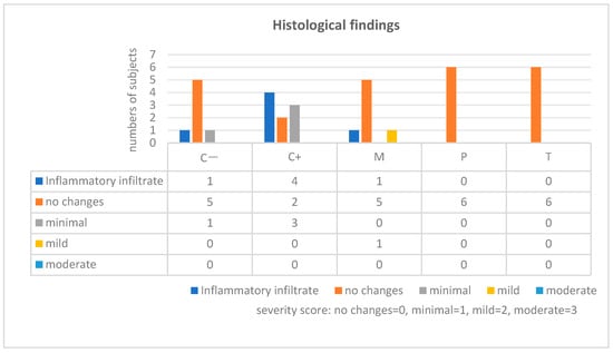 Incidence of myocarditis-suggestive lesions compared across the studied groups and the severity score assessement. C−: negative control group, C+: positive control group with myocarditis induced, M: myocarditis group treated with Mangiferin, P: myocarditis group treated with Prednisone, T: myocarditis group treated with Trolox.