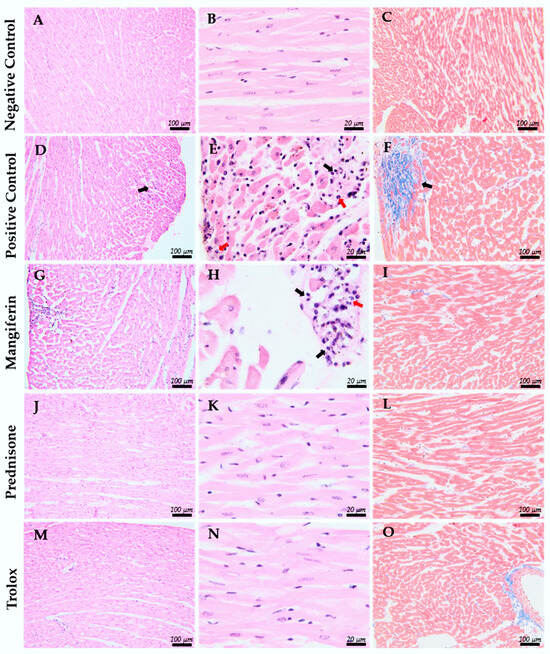 Histopathological images of myocardial tissue. (A–C) Negative control group—no significant findings are observed. (D–F) Positive control group with induced myocarditis (without treatment)—showing multifocal inflammatory infiltrate consisting of mononuclear leukocytes (black arrows), a few neutrophils (red arrows), and focal fibrosis ((F), indicated by the arrow). (G–I) Mangiferin-treated group—in one individual, there is focal inflammatory infiltrate consisting of mononuclear leukocytes (black arrows) with a few neutrophils (red arrows). Significant fibrosis is absent. (J–L) Prednisone-treated group—no significant findings observed. (M–O) Trolox-treated group—no significant findings observed. H&E stain, Obx20: images (A,D,G,J,M); Obx100: images (B,E,H,K,N); TM stain, Obx20: images (C,F,I,L,O).
