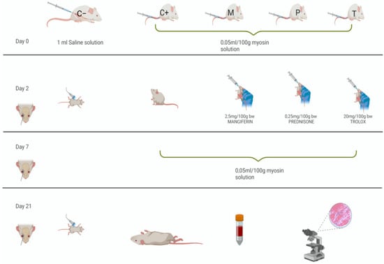 The rats were randomly divided into five groups: negative control group (C−): healthy nontreated rats; positive control group (C+): untreated rats with induced myocarditis; Mangiferin-treated group (M): rats with myocarditis treated with Mangiferin; Prednison-treated group (P): rats with myocarditis treated with Prednisone; Trolox treated group (T): rats with myocarditis treated with Trolox (Figure 6). For the C− group, 1 mL of 0.9% saline solution was injected subcutaneously. The C+, M, P, and T groups received a porcine myosin,calcium activated from porcine heart-buffered aqueous glycerol solution 0.1–0.5 units/mg (Sigma-Aldrich Chemical Co., St. Louis, MO, USA, code M0531) to induce acute myocarditis. This solution was prepared by dissolving one vial of porcine myosin (0.84 mL) in 1.16 mL of Freund’s adjuvant, and 0.05 mL (0.25 mg myosin/100 g body weight) was injected subcutaneously on days 0 and 7.