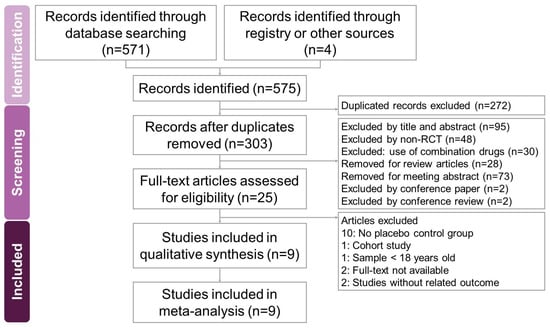 The search and selection process for the trials yielded a comprehensive set of studies for inclusion in this meta-analysis (Figure 1). Our initial search across four databases—PubMed, Embase, Cochrane Library, and Web of Science—along with an additional search using PubMed’s ‘related articles’ feature, yielded a total of 575 trials. After removing duplicates, 303 unique trials remained and were subjected to title and abstract screening, resulting in the exclusion of 278 trials. A detailed full-text review of the 25 remaining trials led to the exclusion of 16 trials for reasons including the absence of a placebo control group (10 trials [18,19,20,21,22,23,24,25,26,27]), being a cohort study (1 trial [28]), involving participants under 18 years old (1 trial [29]), the lack of full-text availability (2 trials [30,31]), and outcomes unrelated to the study’s focus (2 trials [32,33]). Ultimately, nine trials [2,3,15,17,34,35,36,37,38] met the inclusion criteria and were included in this meta-analysis. All selected studies were published in English. Table 1 summarizes the key characteristics of the included trials, which were published between 2004 and 2020. These six trials involved a total of 1085 participants, with the number of participants per trial ranging from 11 to 273. The primary objective of all included trials was to assess the potential effects of vitamin D on chronic pruritus.