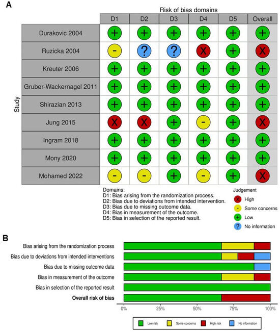 Most trials were assessed as having a low risk of bias, particularly in the selection of reported outcomes (Figure 2). Regarding the randomization process, most studies indicated a low risk of bias, suggesting that randomization was generally well executed. However, there were concerns or insufficient information in some studies [2,36,38], such as Ruzicka (2004), Jung (2015), and Mohamed (2022), leading to uncertainties in this domain. In terms of deviations from intended interventions, most studies also exhibited a low risk of bias, indicating that the interventions were implemented as planned without significant deviations that could have influenced the results. Nevertheless, Jung (2015), Ruzicka (2004), and Mohamed (2022) presented a higher risk of bias in this area, potentially impacting their outcomes. For the domain of missing outcome data, there was variability, with Jung (2015) displaying a high risk of bias due to incomplete data. Other studies predominantly showed low risk or raised some concerns, indicating that the majority of outcomes were sufficiently reported. When evaluating the measurement of outcomes, most studies demonstrated a low risk of bias. However, there were some concerns in studies like Ruzicka (2004), Jung (2015), and Mohamed (2022), possibly due to issues with the assessment or recording of outcomes. Overall, studies such as Ruzicka (2004), Jung (2015), and Mohamed (2022) were identified with a high risk of bias across multiple domains, which may undermine the validity of their results. Conversely, some studies [15,17,34,37] were rated with a low overall risk of bias, indicating that their findings are more likely to be robust and reliable. In conclusion, while most studies demonstrated a low risk of bias across key domains, certain studies with high or uncertain risks in multiple areas require careful interpretation when considering their results in the broader context of the analysis.