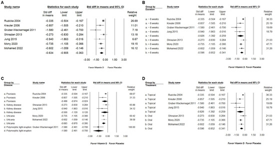 As depicted in Figure 3A, the intervention showed a moderate effect in reducing pruritus among patients who experienced itching (SMD: −0.634, 95% CI: −0.905 to −0.363; I2 = 56.179%, p = 0.033). Subgroup analysis revealed a substantial reduction in pruritus (Figure 3B) for those receiving vitamin D compared to the placebo, particularly in the group with an intervention duration of less than 8 weeks (SMD: −0.826, 95% CI: −1.392 to −0.259; I2 = 71.683%, p = 0.014). In contrast, the group with an intervention duration of more than 8 weeks demonstrated a moderate effect (SMD: −0.596, 95% CI: −0.852 to −0.341; I2 = 0%, p = 0.398). When analyzed by disease diagnosis (Figure 3C), vitamin D exhibited a moderate effect in reducing itch in patients with psoriasis (SMD: −0.499, 95% CI: −0.974 to −0.024; I2 = 57.198%, p = 0.126), kidney disease (SMD: −0.500, 95% CI: −1.120 to −0.120; I2 = 31.929%, p = 0.225), and urticaria (SMD: −0.683, 95% CI: −0.970 to −0.395; I2 = 0%, p = 0.658), whereas a significant effect was observed in the polymorphic light eruption group (SMD: −1.580, 95% CI: −2.461 to −0.700; I2 = 0%, p = 1). Regarding the mode of intervention (Figure 3D), vitamin D applied topically had a significant impact in reducing itch compared to the placebo (SMD: −0.826, 95% CI: −1.392 to −0.259; I2 = 71.683%, p = 0.014), while the oral administration of vitamin D also showed a moderate effect (SMD: −0.596, 95% CI: −0.852 to −0.341; I2 = 0%, p = 0.398). These findings suggest that the topical application of vitamin D may offer more pronounced relief from pruritus compared to oral supplementation.