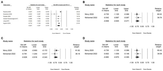 (A) displays the overall impact of vitamin D on chronic pruritus, as measured by the visual analog scale, compared to the placebo. (B–D) show subgroup analyses corresponding to (A): (B) examines the effect based on the duration of treatment, (C) focuses on the specific disease diagnosis, and (D) considers the method of treatment administration. The pruritus-relieving effect of vitamin D is represented by squares, which indicate the standardized mean difference, with the squares shifting to the left to signify a reduction in pruritus. The horizontal lines through the squares depict the 95% confidence intervals, while the diamond symbol represents the pooled effect size [2,3,15,17,34,35,36,37,38].