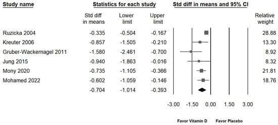 Illustrates the overall effect of vitamin D3 on chronic pruritus, as assessed by the visual analog scale, in comparison to the placebo. The horizontal lines through the squares depict the 95% confidence intervals, while the diamond symbol represents the pooled effect size [2,15,35,36,37,38].