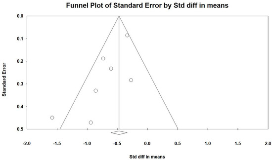 Of the nine studies presented in Figure 3A, one involved the use of vitamin D2 [3], which did not show a significant effect in alleviating chronic pruritus. Consequently, this study was excluded from the sensitivity analysis. Figure 5 demonstrates the impact of vitamin D on reducing chronic pruritus (SMD: −0.704, 95% CI: −1.014 to −0.393; I2 = 62.027%, p = 0.022). The sensitivity analysis revealed no significant differences from the initial findings, confirming that vitamin D continues to exhibit a moderate effect in relieving chronic pruritus.