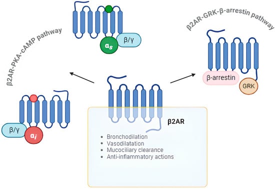 The balance between activated and inactivated forms of β2ARs depends on intracellular cAMP levels. The cAMP accumulation stimulates the phosphorylation of the C-terminus of β2ARs by G protein-coupled receptor kinase (GRK), leading to the dissociation of the α-subunit of the Gs protein and the recruitment and coupling of β-arrestins []. β-arrestins are scaffold proteins that contribute to the desensitization, internalization, and degradation of β2ARs, mediating diverse signaling pathways, including extracellular signal-regulated kinase (ERK), p38 mitogen-activated protein kinase (MAPK), and nuclear factor-kappa B (NF-kB) [,]. By activating the ERK and p38 MAPK pathways, these proteins can induce the following: 1. the transcription and expression of the mucin-5AC (MUC5AC) gene, increasing the airway mucus secretion; 2. the mitosis of ASM cells; 3. the expression of chemokines in eosinophils [,]. Furthermore, β-arrestins can modulate the activation of the NF-kB pathway, which regulates the expression of chemokines and the polarization of macrophages [,]. Thus, the β2AR-GRK-β-arrestin pathway is implicated in inflammatory responses in the airways.