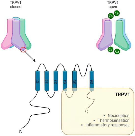 Structurally, TRPV1 is a multimeric protein with a four-fold symmetry axis forming a central ion channel enclosed by protein subunits. Every subunit has an N-terminus (with six ankyrin repeat domains), a transmembrane domain formed by six transmembrane helices (S1-S6), and a C-terminus (Figure 2). The S1-S6 transmembrane helices represent voltage-sensor-like domains, and at the N-terminus, there are ATP- and calmodulin-binding sites []. This channel can be stimulated by various endogenous and exogenous stimuli, including capsaicin, elevated temperature (>43 °C), protons, pro-inflammatory cytokines, and toxins (e.g., lipopolysaccharide) [,]. Once activated, a rearrangement takes place in the S5-S6 outside the pore-loop region of the central ion channel, while the external voltage-sensor-like domains S1-S6 remain unchanged [,]. Capsaicin causes burning pain by selectively activating sensory nerves. The capsaicin-binding site is intracellular on TRPV1 receptors, and the interaction induces the influx of Ca2+ and sodium ions (Na+), depolarizing the cell []. Moreover, TRPV1 is also a sensor of high temperature and acidic extracellular pH (i.e., protons). The reaching of the transition temperature (i.e., ~42 °C) induces the channel opening thanks to the thermosensitive property localized in the S1-S4 domains [,].