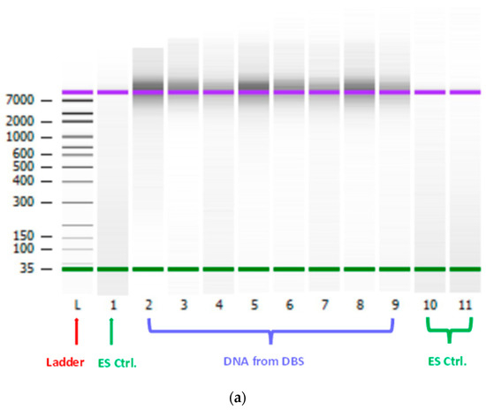 As DNA yields varied, quantification and sizing of gDNA was performed by capillary electrophoresis (CE) using an Agilent 2100 Bioanalyzer (Agilent Technologies Inc., Santa Clara, CA, USA) equipped with Expert 2100 software (Agilent, v. B.02.11.SI824), in combination with Agilent High Sensitivity (HS) DNA kit, which can resolve the size of high molecular weight DNA up to 10,380 bp. The assay was performed according to the instructions provided by the manufacturer. The parallel extraction of empty/blank spots on the same set of DBS protein saver cards was run in the Bioanalyzer at the same time as an extraction control.