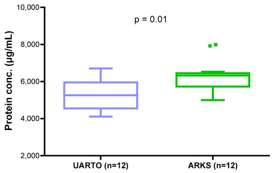 Figure 3. Protein yield comparison between UARTO and ARKS cohorts. Box-and-whisker plots depict the protein concentrations from DBS for UARTO and ARKS cohorts. Significant higher protein concentrations were observed in people living with HIV (PLWH) with confirmed Kaposi sarcoma (KS) (ARKS, n = 12, in green) as compared to the non-KS PLWH cohort (UARTO, n = 12, in blue) (unpaired t-test, p = 0.01).