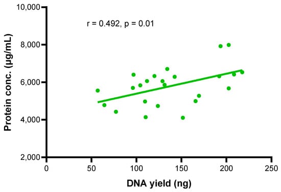 Figure 4. The direct relationship between DNA yield and protein concentration from the same DBS samples (correlation analysis, r = 0.492, p = 0.01, n = 24).