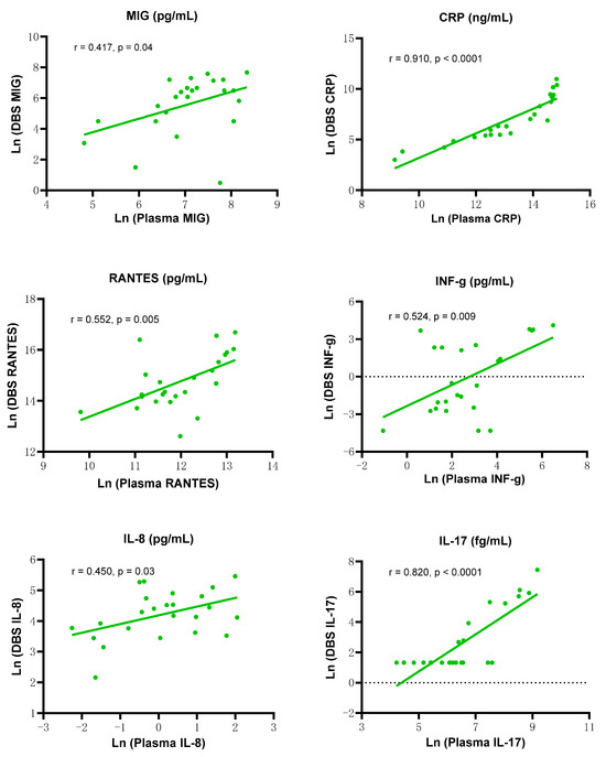 There was a positive correlation between DBS extraction supernatant and paired plasma samples for log-transformed levels of six biomarkers (Figure 5) (correlation analysis, n = 24); MIG (r = 0.417, p = 0.04), CRP (r = 0.910, p < 0.0001), RANTES (r = 0.552, p = 0.005), INF-g (r = 0.524, p = 0.009), IL-8 (r = 0.450, p = 0.03), IL-17 (r = 0.820, p < 0.0001).
