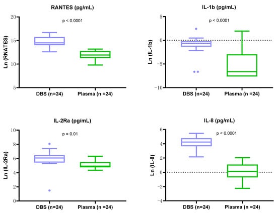 With more than a 10-fold dilution, the log-transformed levels of four biomarkers in DBS extraction supernatants were significantly higher than in paired plasma samples (Figure 6) (paired t-test, n = 24); RANTES (p < 0.0001), IL-1b (p < 0.0001), IL-8 (p < 0.0001), and IL-2Ra (p = 0.01).