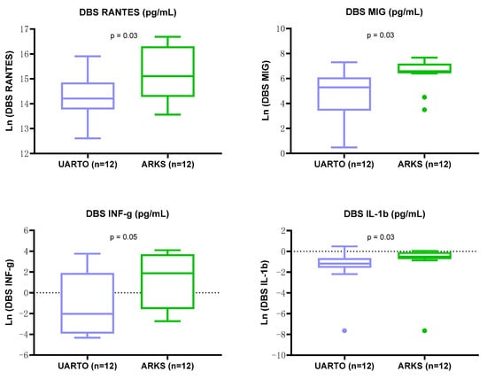 Figure 7. Log-transformed levels of inflammation-associated biomarkers from DBS extraction supernatants were increased in ARKS compared to UARTO participants. Box-and-whisker plots depict the log-transformed biomarker levels of DBS extraction supernatants for UARTO (n = 12, in blue) and ARKS (n = 12, in green). Levels of RANTES (p = 0.03), MIG (p = 0.03), INF-g (p = 0.05), and IL-1b (p = 0.03) were significantly higher in DBS extraction supernatants from the ARKS than from UARTO (unpaired t-test).