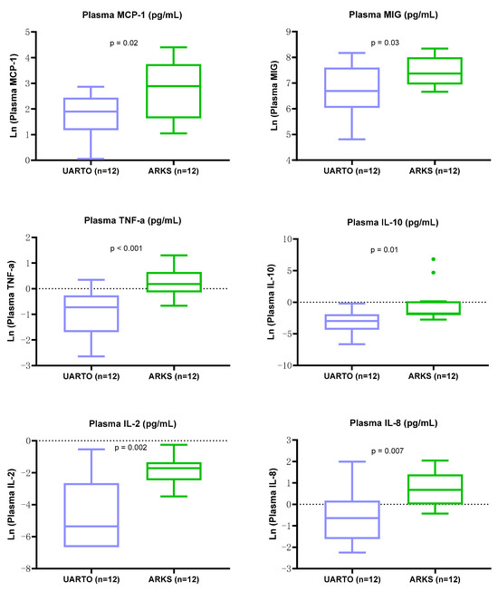 The log-transformed levels of six inflammation-related biomarkers were significantly elevated in ARKS compared to UARTO plasma samples (Figure 8); MCP-1 (p = 0.02), MIG (p = 0.03), TNF-a (p < 0.001), IL-10 (p = 0.01), IL-2 (p = 0.002), and IL-8 (p = 0.007) (unpaired t-test). Note that MIG was also higher in ARKS DBS extraction supernatants than in UARTO.