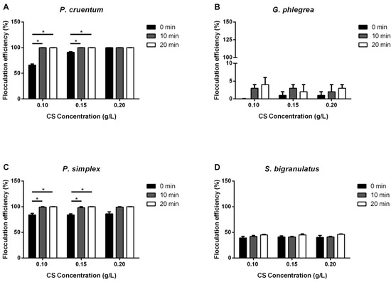 Flocculation efficiency (%) of chitosan (CS). Effect of different CS concentrations on the flocculation efficiency of microalgae strains analyzed immediately (0 min, black bars), 10 min (grey bars) and 20 min (white bars) after stirring. (A), P. cruentum; (B), G. phlegrea; (C), P. simplex; (D), S. bigranulatus upon different flocculation times. Data are obtained by means of three independent experiments (mean ± S.D.). * p < 0.05. The lines above the bars indicate the two samples compared for statistical analysis.