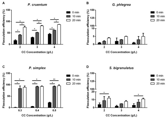 Flocculation efficiency (%) of calcium chloride (CC). Effect of different CC concentrations on the flocculation efficiency of microalgae strains analyzed immediately (0 min, black bars), after 10 min (grey bars) and after 20 min (white bars) from stirring. (A), P. cruentum; (B), G. phlegrea; (C), P. simplex; (D), S. bigranulatus upon different flocculation times. Data are obtained by means of three independent experiments (mean ± S.D.). * p < 0.05, ** p < 0.005. The lines above the bars indicate the two samples compared for statistical analysis.