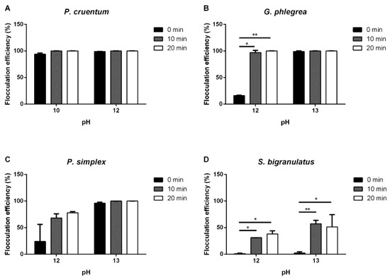 Flocculation efficiency (%) after pH increase. Effect of pH on the flocculation efficiency of microalgae strains analyzed immediately (0 min, black bars), after 10 min (grey bars) and after 20 min (white bars) from stirring. (A), P. cruentum; (B), G. phlegrea; (C), P. simplex; (D), S. bigranulatus upon different flocculation times. Data are obtained by means of three independent experiments (mean ± S.D.). * p < 0.05, ** p < 0.005. The lines above the bars indicate the two samples compared for statistical analysis.