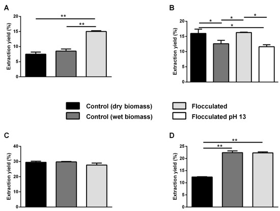 Pigments extraction. Extraction yields (%) are reported as mg of extract with respect to mg of D.W. biomass. Black bars indicate centrifuged dry biomass, dark grey bars indicate centrifuged wet biomass, light grey bars indicate flocculated wet biomass. The white bar refers to flocculated biomass at pH 13. (A), P. cruentum; (B), G. phlegrea; (C), P. simplex; (D), S. bigranulatus. Results are expressed as the mean ± S.D. of three independent experiments. * indicates p < 0.05, ** indicates p < 0.01. The lines above the bars indicate the two samples compared for statistical analysis.