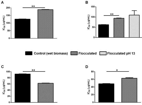Antioxidant activity of ethanol extracts. Values are expressed as IC50 (μg/mL), i.e., the concentration required to scavenge 50% of free radical ABTS. Black bars indicate centrifuged wet biomass, dark grey bars indicate flocculated wet biomass, and the light grey bar indicates flocculated wet biomass at pH 13. (A), P. cruentum; (B), G. phlegrea; (C), P. simplex; (D), S. bigranulatus. Data are shown as means ± S.D. Three independent measurements were carried out. * indicate p < 0.01; ** indicate p < 0.001 with respect to centrifuged wet biomass. The lines above the bars indicate the two samples compared for statistical analysis.