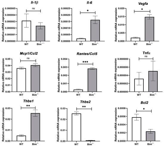 Bim deficiency results in increased VEGF levels. Expression of VEGF, TSP1, TSP2, Bcl-2, and inflammatory mediators was assessed by qPCR analysis in WT and Bim−/− ChECs. These experiments were repeated three times with two different ChEC isolations with similar results. A significant increase in the levels of Il-6, Rantes/Ccl5, VEGF, and TSP1, while a decrease in TSP2 and Bcl-2 levels was observed (* p< 0.05, ** p < 0.01, *** p< 0.001; Student’s unpaired t-test (2-tailed) was utilized). RpL13A, 60S ribosomal protein L13a. ns, not significant.