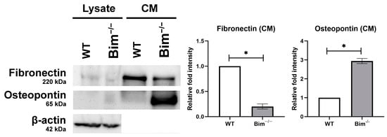 Changes in the expression of osteopontin and fibronectin. Conditioned medium (CM) and cell lysates (25 µg) were analyzed by Western blot analysis. Osteopontin and fibronectin levels, secreted and cell-associated, were assessed in WT and Bim−/− ChECs. β-actin expression was analyzed as a loading control for cell lysates. These experiments were repeated with two different cell isolations in triplicate (* p< 0.05, Student’s unpaired t-test (2-tailed) was utilized).