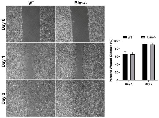 Bim expression does not affect ChEC migration. Migration of WT and Bim−/− ChECs was assessed using a scratch wound assay. Wound closure was assessed at 0, 1, and 2 days from phase images. Both WT and Bim−/− ChECs demonstrated similar migration in this assay. Experiments were repeated three times with two different ChEC isolations with similar results (no significant difference; Student’s unpaired t-test (2-tailed) was utilized).