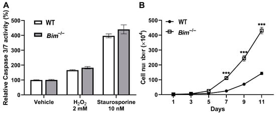 Increased proliferation in Bim−/− ChECs. In Panel (A), WT and Bim−/− ChECs were incubated with vehicle, H2O2 (2 mM), or staurosporine (10 nM) for 24 h. A Caspase 3/7 glo assay was used to assess the levels of apoptotic cells. The growth rate of WT (•) and Bim−/− (□) ChECs (Panel (B)) were counted for 11 days. Similar results were observed when these experiments were repeated with two different isolations of ChECs (*** p< 0.001; Student’s unpaired t-test (2-tailed) was utilized).