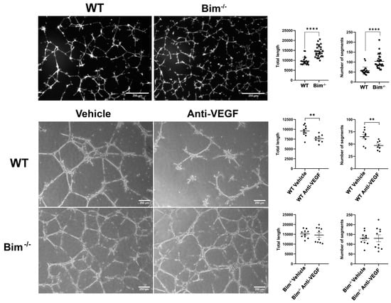 Increased capillary morphogenesis in Bim−/− ChECs. In the upper panel, WT and Bim−/− ChECs were plated on Matrigel; 18 h later, photographs were taken in a digital format. The mean number of segments and total length were determined. In the lower panel, anti-VEGF (1 µg) or vehicle was added to WT and Bim−/− ChECs after overnight plating on Matrigel. Photomicrographs were taken the following day. Similar results were observed with two different isolations of ChECs. The number of segments and total segment length were quantified using the Angiogenesis Analyzer plug-in for ImageJ. Scale bar = 250 µm (** p< 0.01, **** p< 0.0001; Student’s unpaired t-test (2-tailed) was utilized).