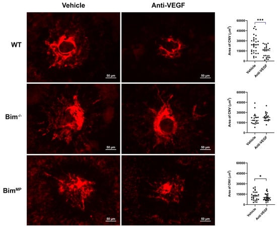Anti-VEGF therapy is the standard treatment for nAMD patients. Since our in vitro data showed that the ability of anti-VEGF to inhibit ChEC capillary morphogenesis relied on Bim expression, we next determined whether the efficacy of anti-VEGF, in vivo, in the mouse CNV model, required Bim expression. WT mice or those lacking Bim expression globally or in MP (BimMP; generated in the laboratory []) were subjected to laser photocoagulation. CNV was assessed 2 weeks later by ICAM-2 staining, a marker of ECs. Anti-VEGF treatment reduced CNV in WT but not in Bim−/− mice (Figure 7). Anti-VEGF treatment also significantly decreased CNV in BimMP mice. Thus, in vivo as in in vitro, the global deletion of Bim decreased the efficacy of anti-VEGF.