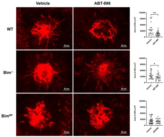 ABT 898 was not effective in reducing CNV in BimMP mice. Male and female WT, Bim−/−, and BimMP mice underwent laser photocoagulation. Mice received intravitreal injection (1 µL) of either vehicle (BSS) or ABT898 (1 µL; 4 µg/µL per eye) the day of laser photocoagulation and 7 days later. Two weeks after photocoagulation, the RPE/choroid was wholemount-stained with anti-ICAM-2 and imaged. The total area (in µm2) was measured using ImageJ software (right panel). Each dot on the plot represents one laser spot. Scale bar = 50 µm. All experiments were repeated with at least 8 mice (* p< 0.05, ** p< 0.01; ANOVA was utilized).