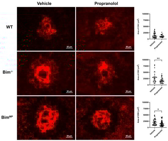 Propranolol effectively reduced CNV in Bim−/− mice. Female WT, Bim−/−, and BimMP mice underwent laser photocoagulation-induced rupture of Bruch’s membrane. Mice received an intraperitoneal injection of vehicle (200 µL PBS) or propranolol (500 µg/200 µL) daily, -3 through 14 days. Two weeks after photocoagulation, the RPE/choroid was wholemount-stained with anti-ICAM-2 and imaged. The total area (in µm2) was determined using ImageJ software (right panel). Each dot on the plot represents one laser spot. Scale bar = 50 µm. All experiments were repeated with at least 8 mice (* p< 0.05, ** p< 0.01; ANOVA was utilized).