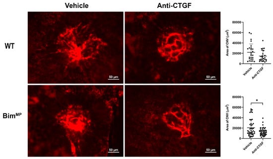 Anti-CTGF reduces CNV in BimMP mice. Male and female WT and BimMP mice received intravitreal injection (1 µL) of either vehicle (PBS) or anti-CTGF (1 µL; 50 ng/µL) the day of laser photocoagulation and 7 days later. Two weeks after photocoagulation, the RPE/choroid was wholemount-stained with anti-ICAM-2 and imaged. The total area (in µm2) was determined using Image J software (right panel). Each dot on the plot represents one laser spot. Scale bar = 50 µm. All experiments were repeated with at least 8 mice (* p < 0.05; Student’s unpaired t-test (2-tailed) was utilized).