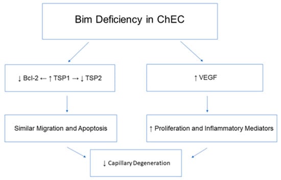 Neovascular age-related macular degeneration (nAMD) occurs when choroidal vessels aberrantly grow through the Bruch’s membrane, leading to a loss of central vision in older adults. Choroidal neovascularization (CNV) is associated with altered choroidal endothelial cells (ChECs), retinal pigment epithelial (RPE) cells, and macrophage apoptosis during active neovascularization []. Unfortunately, there is a limited understanding of the consequences that dysregulated apoptosis has on ChEC characteristics and function. The CNV that accompanies nAMD pathogenesis is largely driven by increased vascular endothelial growth factor (VEGF) expression, the major target of current therapies for this disease. Gaining a better understanding of how Bim expression influences ChEC characteristics and function will allow to better tailor treatment modalities where apoptosis is central to their function.