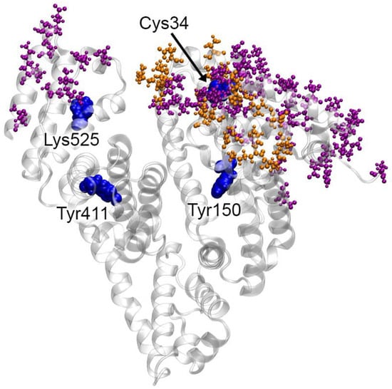- Stewart, A.J.; Blindauer, C.A.; Berezenko, S.; Sleep, D.; Tooth, D.; Sadler, P.J. Role of Tyr84 in controlling the reactivity of Cys34 of human albumin. FEBS J. 2005, 272, 353–362. [Google Scholar] [CrossRef] [PubMed]