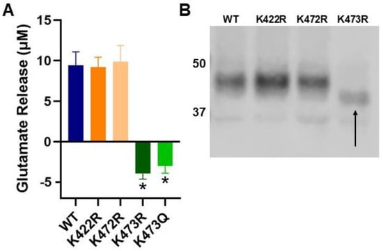 (A) Activity of System xc− measured using a glutamate release assay. COS-7 cells were transiently transfected with myc-WT or mutant xCT and HA-4F2HC and glutamate release assays were performed 48 h later (n = 8, * p < 0.001 relative to WT). (B) Molecular weight analysis of isolated myc-WT and K → R xCT mutants transiently expressed for 48 h in COS-7 with HA-4F2HC before cell lysis. Samples were run on SDS-PAGE, blotted onto PVDF membrane and probed with mouse anti-myc antibody. WT, K422R, and K472R appear to be the same molecular weight, while K473R, as indicated with an arrow, is approximately 7.5 kD lower in molecular weight (n = 3).