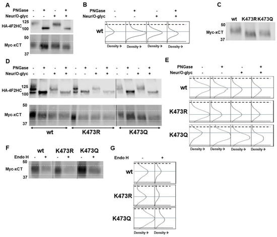 The fact that K473Q is glycosylated but still exhibits a lower molecular weight than WT xCT may also suggest that the glycosylation of K473Q has not fully matured. Proteins are initially glycosylated in the endoplasmic reticulum, but the sugar groups are modified within the Golgi apparatus []. PNGase F removes all N-linked glycans by cleaving the bond between the sugar and the asparagine residue; therefore, the enzyme functions independent of the maturation state of the glycan. Endo H, however, is a glycosidase that cleaves the bond between two sugars that make up the immature glycan core. Thus, if a glycosylated protein is sensitive to Endo H, it means that the glycan has not fully matured in the Golgi and retains a structure that was originally added in the endoplasmic reticulum. Therefore, we tested the sensitivity of immunoprecipitated WT, K473R and K473Q to Endo H (Figure 5F,G). WT xCT and K473R were not sensitive to EndoH treatment, exhibiting no change in molecular weight after 3 h of treatment with EndoH. K473Q, however, exhibited a change in molecular weight such that it became equal to K473R, demonstrating that the attached glycan group was not fully matured.
