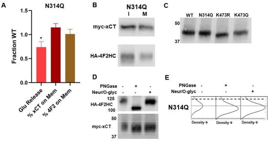 (A) myc-N314Q xCT was transiently expressed with HA-4F2HC in COS-7 cells and examined for function (glutamate release) and fraction localization on the membrane (biotinylation assay) relative to WT xCT. Localization of HA-4F2HC to the membrane was also measured in COS-7 cells when co-expressed with N314Q in comparison to WT. * p = 0.05). (B) Representative intracellular (I) and membrane (M) bands of myc-N314Q xCT and HA-4F2HC from biotinylation assays. (C) Molecular weight analysis of immunoprecipitated WT, N314Q, K473R, and K473Q. (D) Immunoprecipitated myc-N314Q xCT shows molecular weight reductions when treated with PNGase F and Neur/O-glyc, similar to WT. dashed line indicates the position of top of the N314Q band. The dotted line indicates the position of the bottom of the N314Q band treated with PNGaseF. Co-immunoprecipitated 4F2HC is only sensitive to PNGase F. (E) Density plots for the bands of myc-N314Q xCT when treated with PNGase F and Neur/O-glyc to more clearly show molecular weight shifts. Pixel density increases from left to right, using the same scale for each band. Dashed and dotted lines from blot in D are added for reference. The solid blue line indicates the middle of the untreated N314Q xCT band to aid in the assessment of molecular weight shifts.
