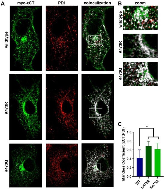 (A) Immunocytochemistry coupled with confocal microscopy was used to examine the colocalization of WT, K473R or K473Q xCT with PDI, an ER marker. COS-7 cells were transiently transfected with 4F2HC and WT, K473R, or K473Q for 48 h and then fixed for immunocytochemical analysis. Confocal images (single confocal section) show myc-xCT (green), PDI (red), and the Manders colocalization of xCT with PDI (white). (B) Zoom image of area of prominent ER density for each xCT construct indicated by white box in A. (C) Fraction of xCT signal that is colocalized with PDI was calculated by performing a Manders colocalization analysis (* p < 0.01).