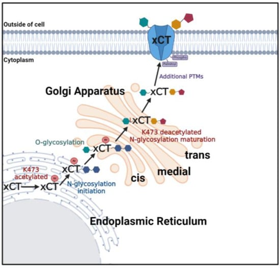 Based on these collective results, we have developed a hypothetical model that explains how K473 may regulate xCT trafficking (Figure 10) []. This model shares several similarities with other proteins that are known to be acetylated in the ER and deacetylated in the Golgi [,]. We suggest that acetylation of K473 in the ER allows for the initiation of N-glycosylation and the subsequent export of xCT from the ER into the cis-Golgi where it is O-glycosylated. Furthermore, we propose that xCT must be deacetylated at K473 in order to exit the cis-Golgi, so that the N-glycan can undergo remodeling in the medial- and trans-Golgi. Ultimately, it is exported from the Golgi within vesicles in the cytoplasmic compartment, where it can be further post-translationally modified and eventually trafficked to the plasma membrane. Given that K473R and K473Q were still able to co-immunoprecipitate 4F2HC and were shown to co-localize with 4F2HC within COS-7 cells, we do not believe that K473 regulates the interaction between xCT and 4F2HC. Therefore, we suggest that xCT and 4F2HC associate early in the ER, but, for simplicity, we have elected to omit 4F2HC from our model.