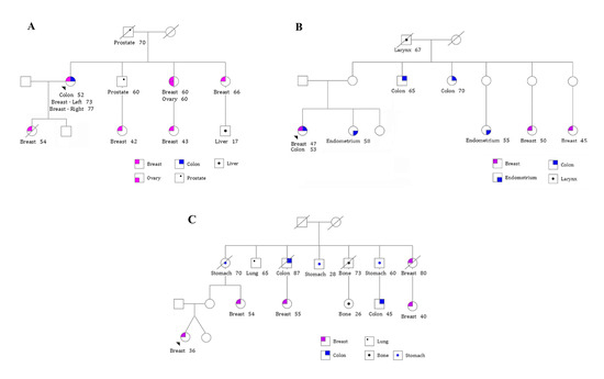 Patients with BC have a higher risk of developing CRC as a second primary malignancy [3], and the opposite is also true [4]. The co-occurrence of BC and CRC has been reported in some families [5,6,7,8]. One of the main risk factors associated with the development of multiple primary tumors is mutation in hereditary cancer predisposition genes [3,9]. Although 20–30% of BC and CRC patients seem to have a familial or heritable cancer-associated component, only 5–10% are classified as hereditary due to the presence of pathogenic variants in well-known high-penetrance genes [10,11].