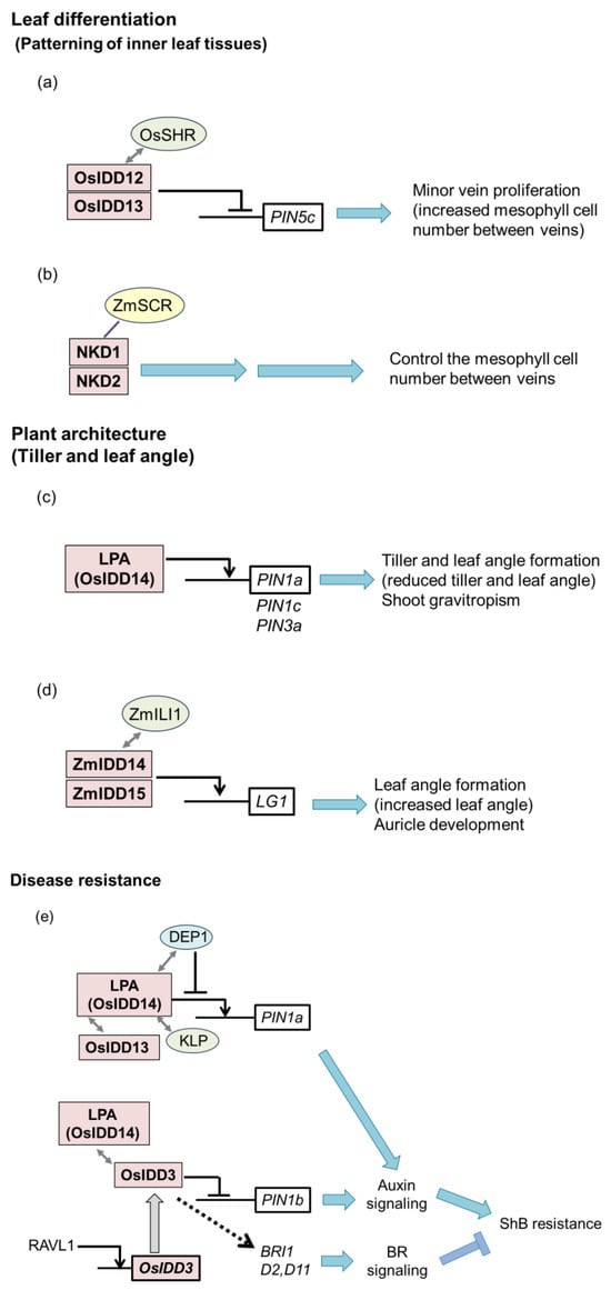 Subsequent research identified several factors that interact with OsLPA1, OsIDD13, OsIDD3, kinesin-like protein (KLP), and DENSE AND PANICLE 1 (DEP1) [45,46,47]. OsIDD13 and OsIDD3 positively and negatively regulate OsPIN1a expression, respectively [45]. Moreover, OsIDD13, OsIDD3 and OsLPA1 form a transcription factor complex that regulates the OsPIN1a gene. Accordingly, OsIDD13 and OsIDD3 increase and decrease ShB resistance, respectively [45] (Figure 2e).
