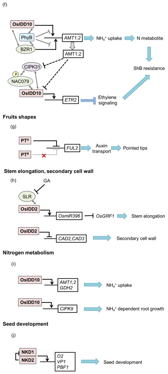 The regulation of auxin synthesis and transport is a shared function among SG5 lineage IDDs in Arabidopsis and grasses [11,22,38]. However, several functions of the SG5 lineage IDDs from Arabidopsis have not been reported in rice or maize.