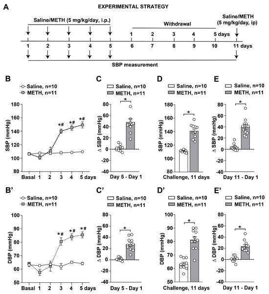 Methamphetamine (METH) induces SBP and DBP sensitization in mice. (A) Diagram showing the protocol used for monitoring SBP and DBP values in mice subjected to daily intraperitoneal (i.p.) injection of saline or METH (5 mg/kg) for 5 days and then re-challenged with saline or METH following 6 days of withdrawal on day 11. SBP and DBP were monitored by the tail-cuff plethysmography before treatments (Basal) and 30 min after each injection with saline or METH. SBP and DBP values monitored in mice treated with saline or METH for 5 days are shown in (B,B’), respectively. Values are the means ± S.E.M. p < 0.05, (*) vs. saline; (#) vs. Basal, day 1 and day 2 (two-way ANOVA for repeated measures with Bonferroni’s test). Difference in SBP values (Δ SBP) and DBP values (Δ DBP) monitored at 30 min after saline or METH injections between days 5 and day 1 (Day 5–Day 1) is shown in (C,C’), respectively. Values are the means ± S.E.M. * p < 0.05 (unpaired two-tailed Student’s t-test). SBP and DBP values monitored in mice at 30 min after the challenge with saline or METH performed following 6 days of withdrawal on day 11 are shown in (D,D’), respectively. Values are the means ± S.E.M. * p < 0.05 (unpaired two-tailed Student’s t-test). Difference in SBP values (Δ SBP) and DBP values (Δ DBP) monitored at 30 min after saline or METH injections between days 11 and day 1 (Day 11–Day 1) are shown in (E,E’), respectively. Values are the means ± S.E.M. * p < 0.05 (unpaired two-tailed Student’s t-test).