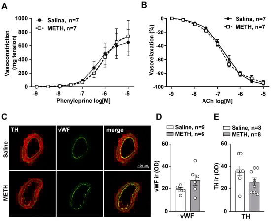 Therefore, we examined whether the hypertensive effects induced in response to repeated treatments with METH could be due to an exaggerated arterial response to the vasoconstrictor activity induced by norepinephrine (NE). Alternatively, a suppression of the arterial response to ACh may lead to altered regulation by the vascular endothelium. Therefore, we measured vascular reactivity in resistance vessels (mesenteric arteries) isolated from saline or METH-injected mice. Treatment with METH did not affect either phenylephrine-mediated vasoconstriction (Figure 2A) or ACh-mediated vasodilation (Figure 2B). This indicates that no change in vascular reactivity occurred. Nonetheless, since METH increases NE release, one may still consider that repeated stimulation of presynaptic orthosympathetic nerve endings at the level of the arterial wall may be responsible for the onset of SBP sensitization. This is likely to be the case due to increased activity promoted by medullary vasomotor centers. Still, no morphological alterations were detected concerning both orthosympathetic and parasympathetic nerve endings within the arterial wall when immunohistochemistry was carried out. In fact, double immunofluorescence analysis of TH expression co-localized with von Willebrand factor (vWF) did not provide a significant difference when tested within sections of mesenteric arteries (Figure 2C–E). This indicates that METH-induced SBP and DBP sensitization was not related to changes within the arterial wall (neither functional nor anatomical) in either the muscle or endothelial layers. It is important to emphasize that these results were obtained within resistance vessels which are responsible for regulating vascular resistance, thereby affecting, according to the Poiselle’s law, blood pressure.
