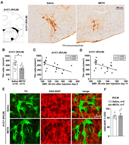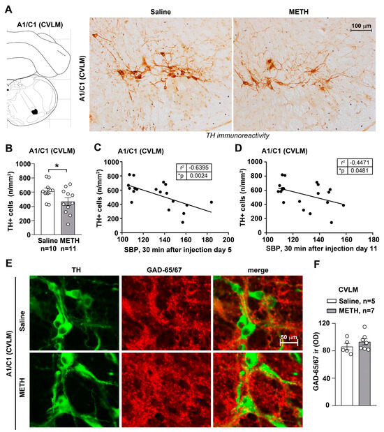 2.2. METH Sensitization Is Concomitant with Reduced Catecholamine Cell Density in A1/C1 of the Rostral and Caudal Ventrolateral Medulla (RVLM and CVLM)